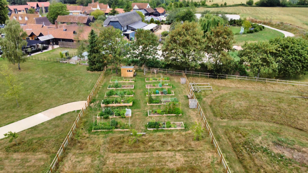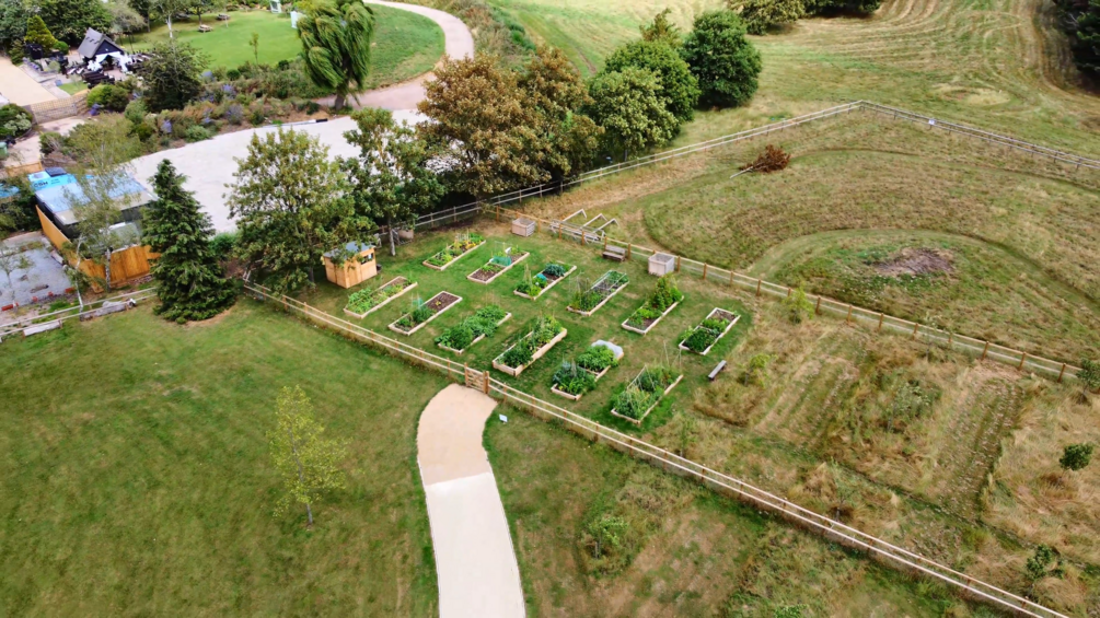 A pack of 14 aerial stock footage shots of a community gardens project in Chelmsford, Essex, UK