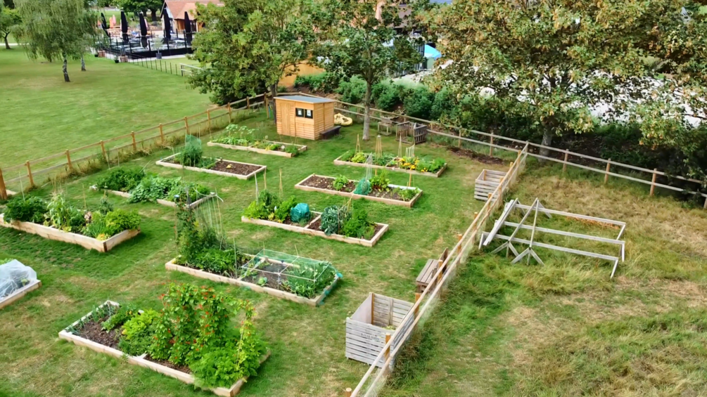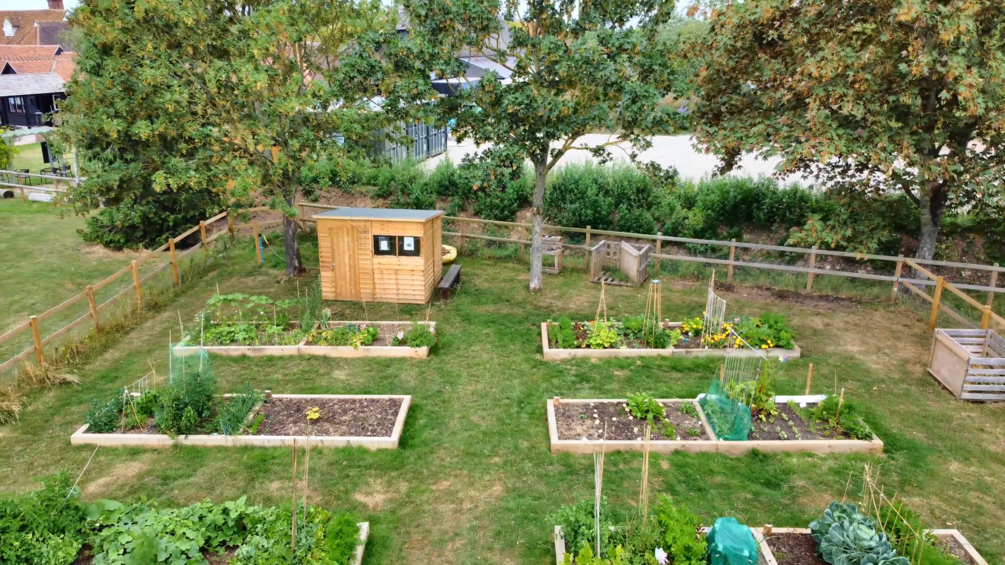 A curated pack of 14 aerial stock footage clips documenting community gardens and shared growing spaces on a countryside housing estate in Chelmsford, Essex (UK). Filmed in the summer from a range of heights and movement styles, these clips provide strong establishing shots and contextual visuals that situate food growing within a lived-in, middle-class residential environment rather than a dense urban setting.